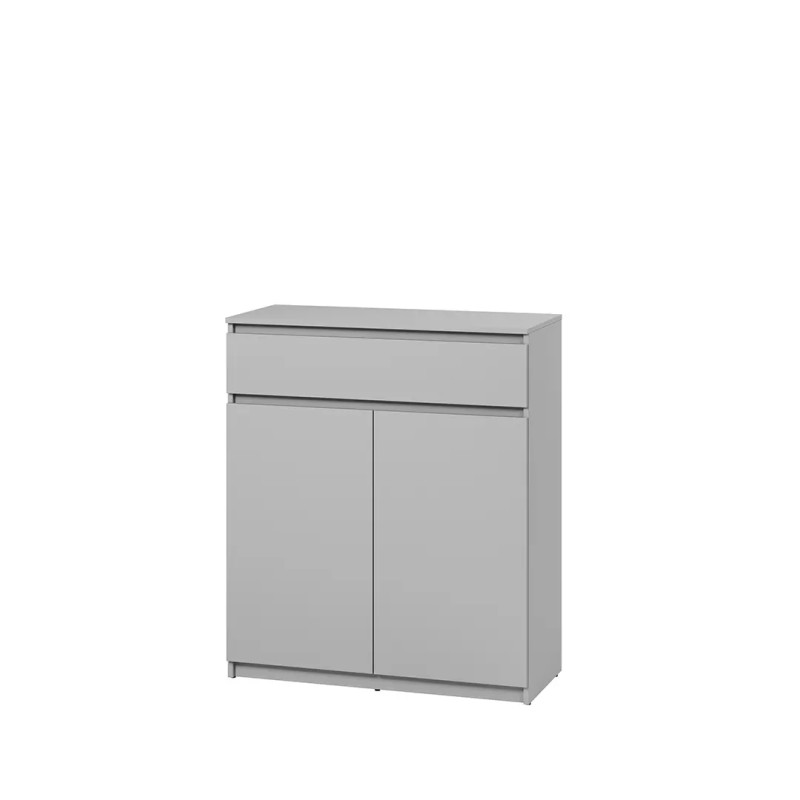 Wykonana z wysokiej jakości płyty wiórowej laminowanej o grubości 16 mm, komoda charakteryzuje się trwałością i odpornością na uszkodzenia. Obrzeża wykończone ABS zwiększają jej wytrzymałość. Brak tradycyjnych uchwytów oraz zastosowanie podchwytów do otwierania drzwi i szuflady nadaje meblowi nowoczesny, minimalistyczny wygląd. Nóżki w formie ślizgów ułatwiają przesuwanie komody oraz utrzymanie czystości pod meblem.