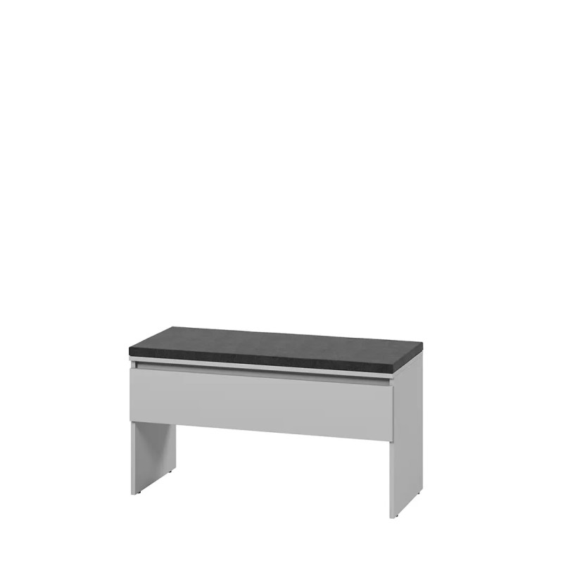 Wykonana z płyty wiórowej laminowanej o grubości 16 mm, ławka cechuje się trwałością i odpornością na uszkodzenia. Obrzeża wykończone ABS zwiększają jej wytrzymałość. Siedzisko tapicerowane pianką o grubości 3 cm zapewnia komfort użytkowania. Brak tradycyjnych uchwytów oraz zastosowanie podchwytów do otwierania drzwi nadaje meblowi nowoczesny, minimalistyczny wygląd. Nóżki w formie ślizgów ułatwiają przesuwanie ławki oraz utrzymanie czystości pod meblem. Zawiasy puszkowe i siłownik gazowy zapewniają płynne i ciche otwieranie szafki.