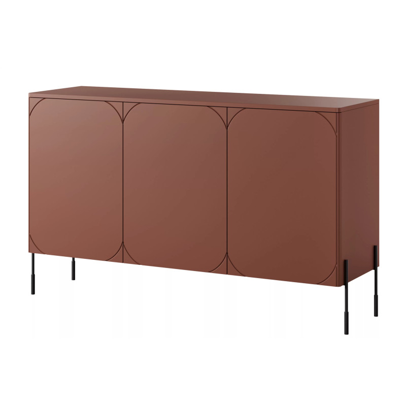 Komoda Sonatia to elegancki mebel, który łączy nowoczesny design z funkcjonalnością. Wykonana z wysokiej jakości materiałów, takich jak płyta MDF oklejona folią PCV oraz płyta laminowana, zapewnia trwałość i odporność na zarysowania. Dzięki matowemu wykończeniu w kolorze burgundowym, komoda emanuje subtelnym, ale wyrazistym charakterem, który doskonale wkomponuje się w nowoczesne wnętrza. Czarne, metalowe nóżki o wysokości 20 cm dodają lekkości całej konstrukcji, podkreślając jej stylowy wygląd.