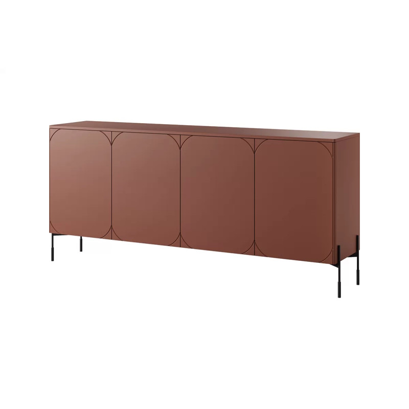 Komoda Sonatia to elegancki mebel, który łączy nowoczesny design z funkcjonalnością. Wykonana z wysokiej jakości materiałów, takich jak płyta MDF oklejona folią PCV oraz płyta laminowana, zapewnia trwałość i odporność na zarysowania. Dzięki matowemu wykończeniu w kolorze burgundowym, komoda emanuje subtelnym, ale wyrazistym charakterem, który doskonale wkomponuje się w nowoczesne wnętrza. Czarne, metalowe nóżki o wysokości 20 cm dodają lekkości całej konstrukcji, podkreślając jej stylowy wygląd.