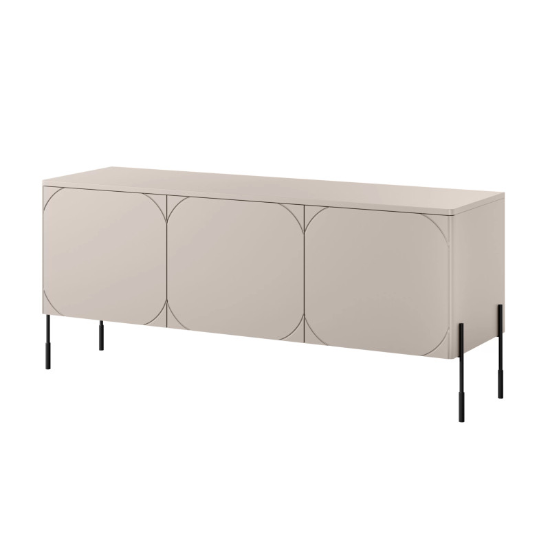 Szafka RTV z kolekcji Sonatia to elegancka propozycja, która łączy nowoczesny design z funkcjonalnością. Wykonana z wysokiej jakości materiałów, takich jak płyta MDF oklejona folią PCV oraz płyta laminowana, charakteryzuje się wyjątkową trwałością i odpornością na zarysowania oraz działanie promieni słonecznych. Efektowne, metalowe nogi malowane proszkowo na czarny kolor oraz subtelne, matowe wykończenie korpusu i frontów w odcieniu kaszmiru nadają meblu nowoczesny, a zarazem ponadczasowy charakter.