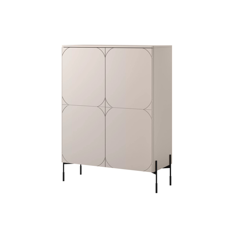 Kredens Sonatia to elegancki mebel, który łączy nowoczesny design z funkcjonalnością. Wykonany z wysokiej jakości płyty MDF o grubości 18 mm, pokrytej matową folią w odcieniu kaszmiru, stanowi wyjątkowy element wyposażenia, który doskonale wkomponuje się w różne style wnętrz. Jego subtelna kolorystyka oraz gładkie fronty bez uchwytów nadają meblowi minimalistyczny charakter, który harmonijnie łączy się z czarnymi, metalowymi nogami malowanymi proszkowo. Wysokość nóg, wynosząca 20 cm, sprawia, że kredens zyskuje lekkości i elegancji, jednocześnie ułatwiając utrzymanie czystości pod spodem.