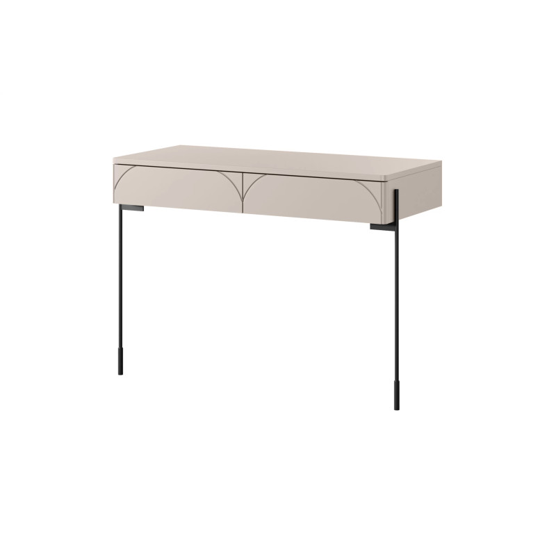 Toaletka Sonatia to elegancki i nowoczesny mebel, który doda klasy każdemu wnętrzu. Wykonana z wysokiej jakości płyty MDF o grubości 18 mm, wykończona matową folią w głębokim odcieniu kaszmiru, to doskonały wybór do współczesnych sypialni. Jej minimalistyczny design pozbawiony uchwytów podkreśla gładkie fronty, a brak widocznych elementów dodatkowych sprawia, że mebel ma subtelną, ale elegancką formę. Wysokie, metalowe nogi malowane proszkowo na kolor czarny, o wysokości 67 cm, nadają toaletce lekkości i stylowego wyglądu, a jednocześnie zapewniają jej stabilność.