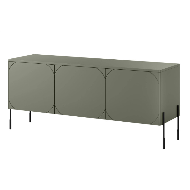 Szafka RTV z kolekcji Sonatia to elegancka propozycja, która łączy nowoczesny design z funkcjonalnością. Wykonana z wysokiej jakości materiałów, takich jak płyta MDF oklejona folią PCV oraz płyta laminowana, charakteryzuje się wyjątkową trwałością i odpornością na zarysowania oraz działanie promieni słonecznych. Efektowne, metalowe nogi malowane proszkowo na czarny kolor oraz subtelne, matowe wykończenie korpusu i frontów w odcieniu oliwki nadają meblu nowoczesny, a zarazem ponadczasowy charakter.