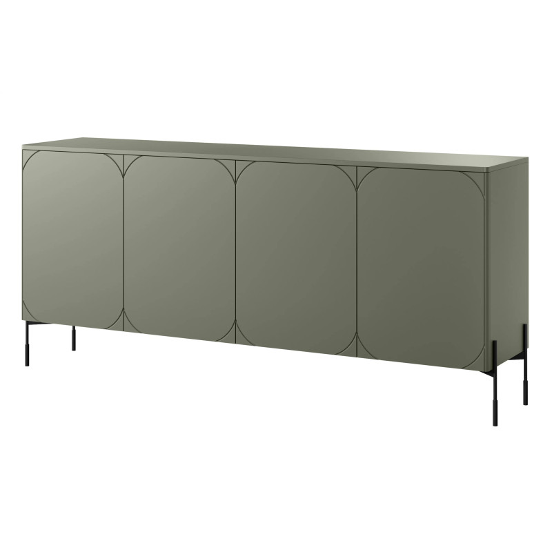 Komoda Sonatia to elegancki mebel, który łączy nowoczesny design z funkcjonalnością. Wykonana z wysokiej jakości materiałów, takich jak płyta MDF oklejona folią PCV oraz płyta laminowana, zapewnia trwałość i odporność na zarysowania. Dzięki matowemu wykończeniu w kolorze oliwkowym, komoda emanuje subtelnym, ale wyrazistym charakterem, który doskonale wkomponuje się w nowoczesne wnętrza. Czarne, metalowe nóżki o wysokości 20 cm dodają lekkości całej konstrukcji, podkreślając jej stylowy wygląd.