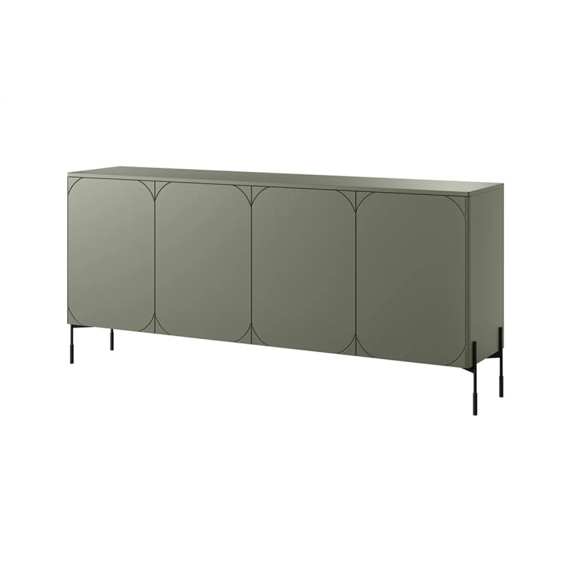 Komoda Sonatia to elegancki mebel, który łączy nowoczesny design z funkcjonalnością. Wykonana z wysokiej jakości materiałów, takich jak płyta MDF oklejona folią PCV oraz płyta laminowana, zapewnia trwałość i odporność na zarysowania. Dzięki matowemu wykończeniu w kolorze oliwkowym, komoda emanuje subtelnym, ale wyrazistym charakterem, który doskonale wkomponuje się w nowoczesne wnętrza. Czarne, metalowe nóżki o wysokości 20 cm dodają lekkości całej konstrukcji, podkreślając jej stylowy wygląd.