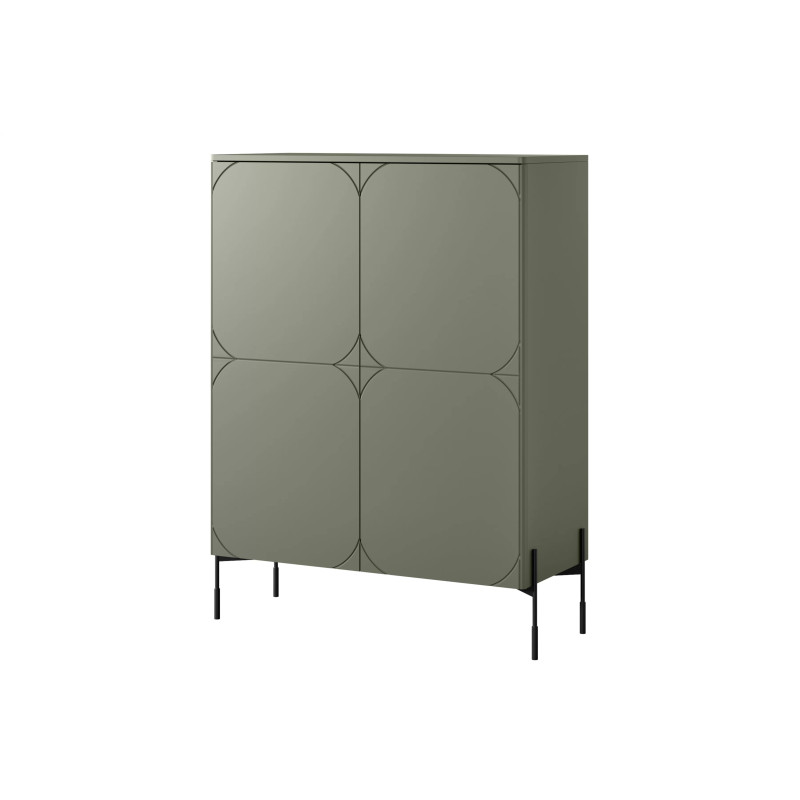 Kredens Sonatia to elegancki mebel, który łączy nowoczesny design z funkcjonalnością. Wykonany z wysokiej jakości płyty MDF o grubości 18 mm, pokrytej matową folią w odcieniu oliwki, stanowi wyjątkowy element wyposażenia, który doskonale wkomponuje się w różne style wnętrz. Jego subtelna kolorystyka oraz gładkie fronty bez uchwytów nadają meblowi minimalistyczny charakter, który harmonijnie łączy się z czarnymi, metalowymi nogami malowanymi proszkowo. Wysokość nóg, wynosząca 20 cm, sprawia, że kredens zyskuje lekkości i elegancji, jednocześnie ułatwiając utrzymanie czystości pod spodem.