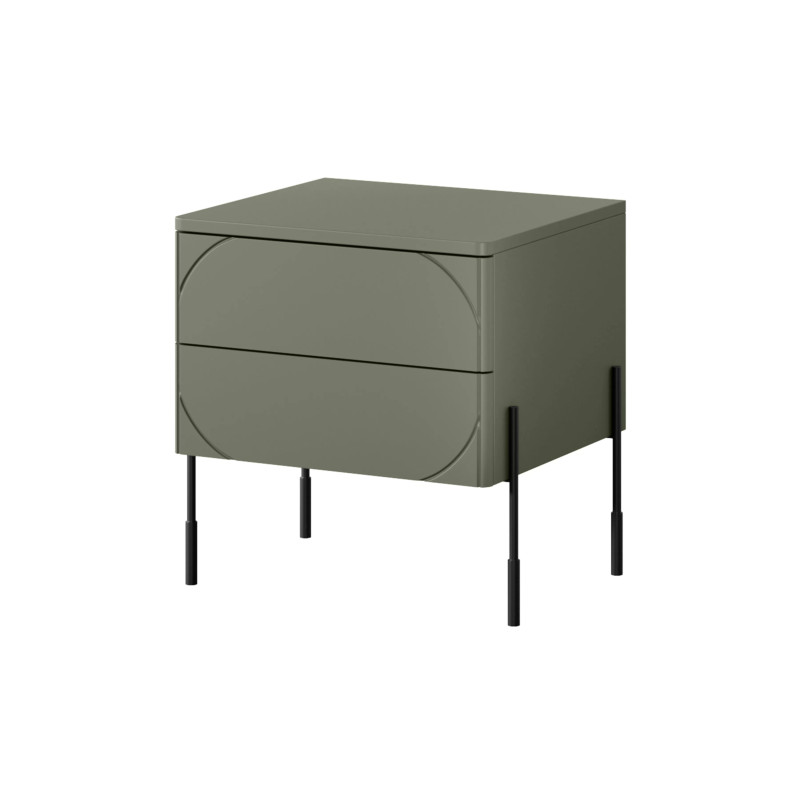 Szafka nocna Sonatia to elegancki i funkcjonalny mebel, który doskonale sprawdzi się w nowoczesnych sypialniach. Wykonana z płyty MDF o grubości 18 mm, pokrytej matową folią w głębokim oliwkowym kolorze, szafka emanuje subtelnym, ale wyrazistym stylem. Gładkie fronty bez uchwytów nadają jej minimalistyczny charakter, który w połączeniu z czarnymi, metalowymi nóżkami malowanymi proszkowo, tworzy spójną i nowoczesną całość. Nogi o wysokości 20 cm zapewniają odpowiednią lekkość, a także ułatwiają utrzymanie porządku pod meblem.