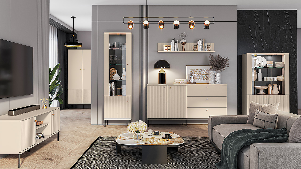 Witryna Sophie to nie tylko miejsce do wyeksponowania Twoich ulubionych przedmiotów, ale także praktyczne rozwiązanie do przechowywania. Jej kaszmirowe fronty MDF z ozdobnymi, frezowanymi lamelami dodają meblom wyjątkowego uroku i elegancji, co dodatkowo podkreślają harmonizujące, metalowe uchwyty w kolorze szczotkowanego złota
