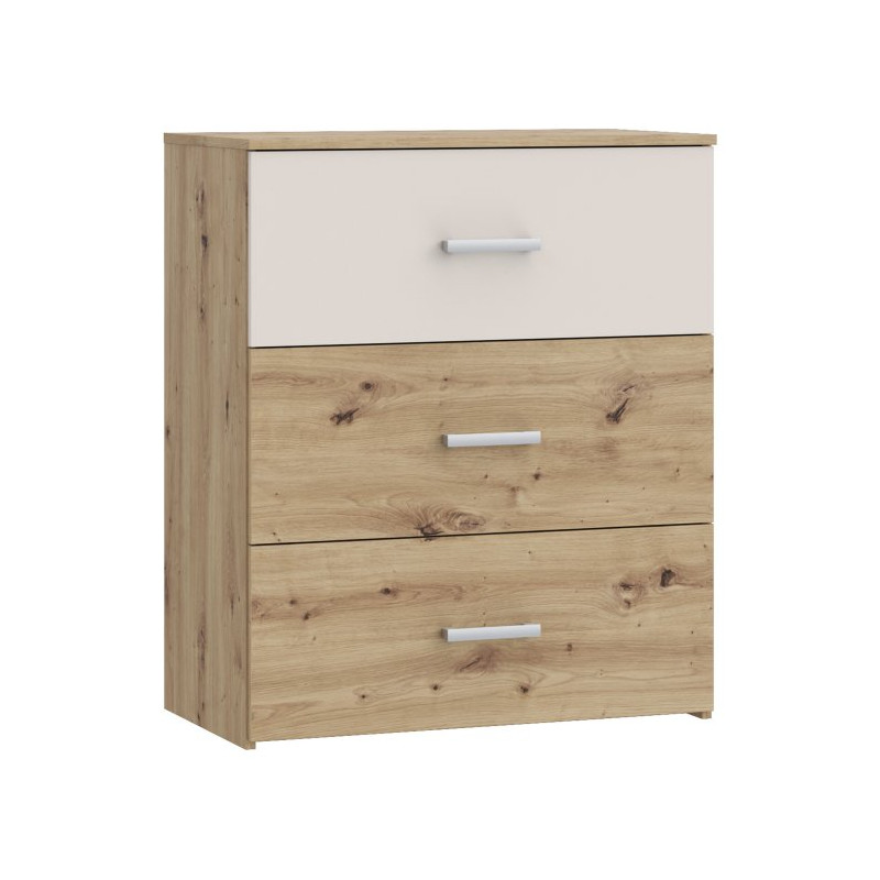 Trzy pojemne szuflady zapewniają wygodne miejsce do przechowywania, pomagając utrzymać porządek i dobrą organizację przestrzeni. Solidna konstrukcja oraz funkcjonalny układ sprawiają, że komoda jest komfortowa w codziennym użytkowaniu i spełnia oczekiwania nawet bardziej wymagających użytkowników.