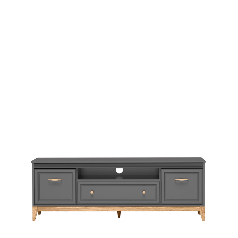 Model oferuje dwie zamykane szafki, dwie szuflady oraz pojemną centralną wnękę, idealną na soundbar, konsolę, dekoder lub inne urządzenia RTV. Dzięki szerokości 179 cm szafka dobrze współgra z dużymi telewizorami. Całość uzupełnia oświetlenie LED pod blatem w standardzie, aktywowane dotykowo, które podkreśla nowoczesny charakter bryły.