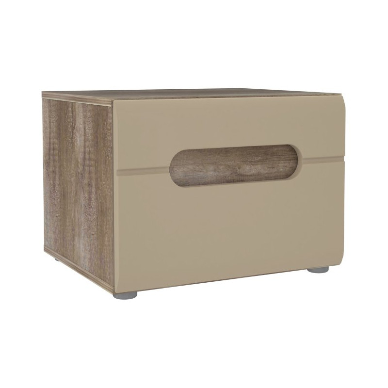Model wyposażony jest w praktyczną szufladę, która umożliwia wygodne przechowywanie najpotrzebniejszych rzeczy, takich jak książki, telefon czy drobne akcesoria. Blat zapewnia miejsce na lampkę nocną lub dekoracje, a frezowany front pełni funkcję uchwytu, podkreślając nowoczesny charakter mebla.