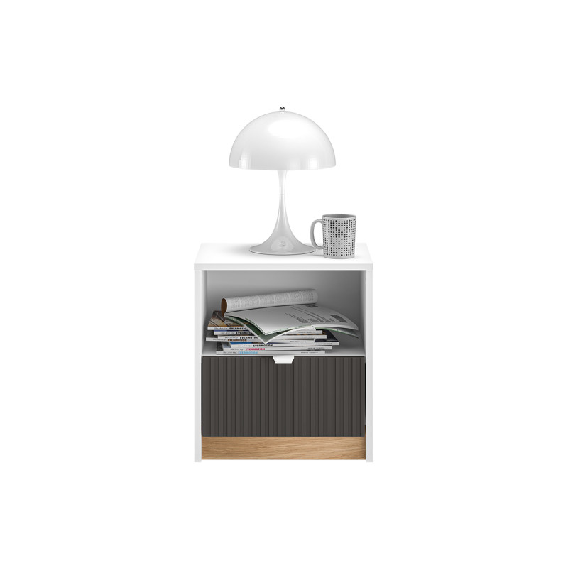 Szafka nocna Torino to elegancki i praktyczny dodatek do każdej sypialni lub pokoju młodzieżowego, który łączy nowoczesny styl z funkcjonalnością. Wykonana w harmonijnej kolorystyce bieli, grafitowego MDF i Dębu Castello, wprowadza do wnętrza subtelny, a zarazem wyrazisty akcent.