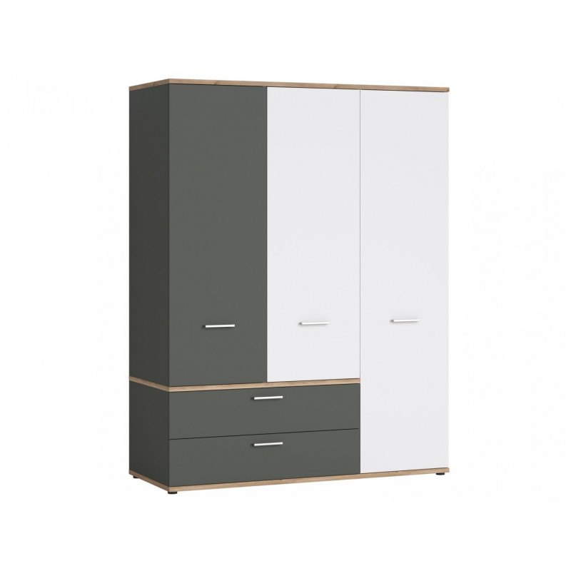 Szafa trzydrzwiowa wykonana została z płyty wiórowej laminowanej, wyróżniającej się wysoką jakością, widoczną w wieloletnim, niezawodnym użytkowaniu. Mebel posiada dwie, szerokie szuflady, osadzone na kulkowych prowadnicach, gwarantujących pełny wysuw nawet wypełnionej przestrzeni. Drzwi zawierają zawiasy, zapewniające cichy domyk. Efektowna, duża szafa posiada pojemne półki oraz dwa, oddzielnie umieszczone drążki na ubrania wiszące. Zastosowany dla mebla niezwykle praktyczny układ wewnętrzny pozwala na zastosowanie jej w pokoju rodzeństwa.