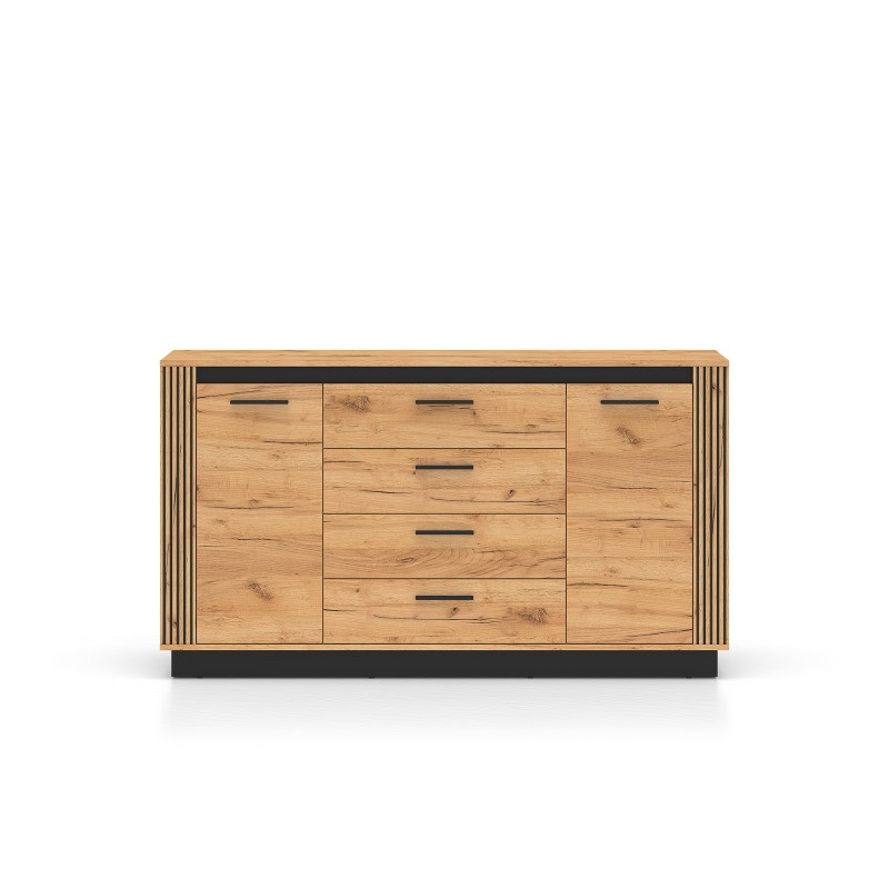 Fronty komody w kolorze Dąb Craft Złoty oraz subtelne czarne elementy tworzą harmonijną kompozycję, która przyciąga wzrok. Korpus w odcieniu Dębu Craft Złotego podkreśla nowoczesny charakter mebla. Obrzeża ABS zapewniają trwałość i odporność na uszkodzenia, co sprawia, że komoda będzie cieszyć swoją estetyką przez długie lata.