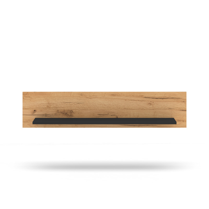 Półka wykonana jest w całości z trwałego materiału w odcieniu Dębu Craft Złotego, co podkreśla jej solidność oraz nowoczesny charakter. Czarne wstawki dodają jej wyrazistości, tworząc harmonijną kompozycję, która przyciąga wzrok i podkreśla indywidualny styl wnętrza.