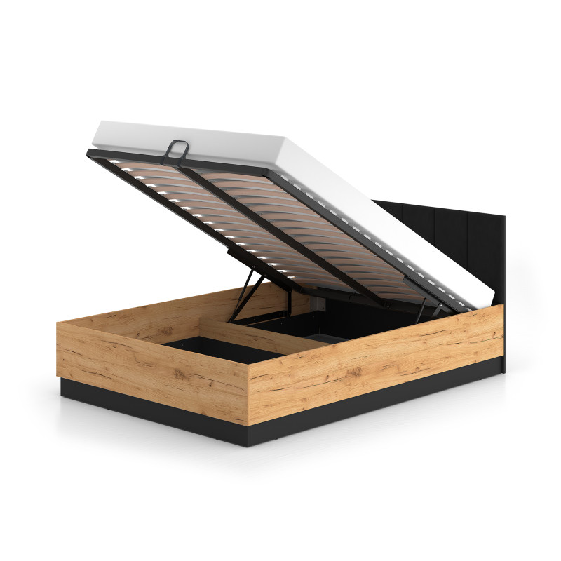 Wezgłowie łóżka wykonane jest z tapicerowanej tkaniny w czarnym kolorze, co nadaje mu wyjątkowego charakteru i podkreśla nowoczesny design. Solidna konstrukcja z wysokiej jakości materiałów zapewnia stabilność oraz długotrwałą trwałość, a obrzeża ABS chronią mebel przed uszkodzeniami, zwiększając jego odporność na codzienne użytkowanie.