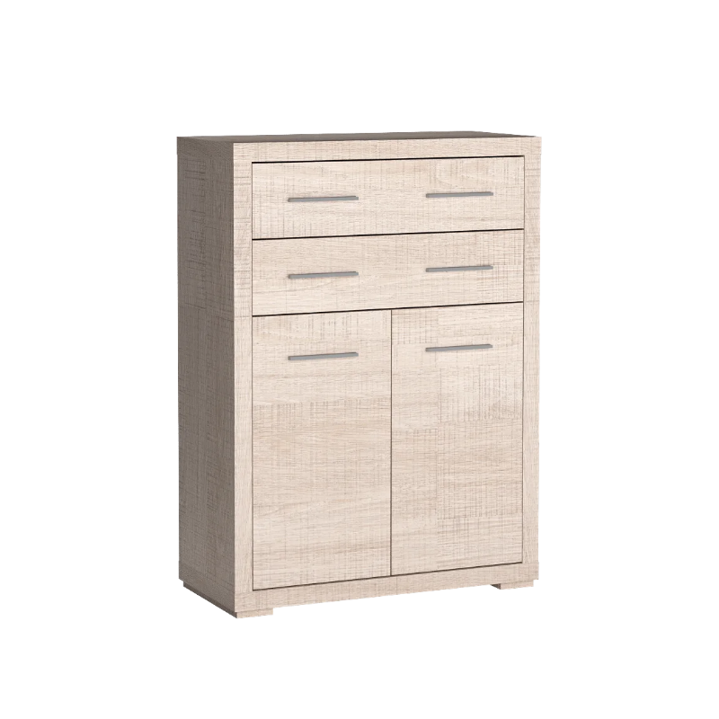 Mebel wykonany jest z wysokiej jakości laminowanej płyty meblowej, co zapewnia trwałość i łatwość w utrzymaniu czystości. Obrzeża ABS zabezpieczają przed uszkodzeniami mechanicznymi, natomiast tył komody z płyty HDF dodaje stabilności i solidności całej konstrukcji. Metalowe uchwyty nadają komodzie nowoczesny, elegancki wygląd.