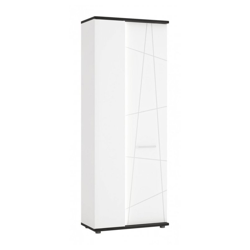 Szersze drzwi bieliźniarki ozdobione są geometrycznym wzorem linii, co dodaje meblowi elegancji. Mebel został wyposażony w regulowane półki oraz mechanizm cichego domykania, co zwiększa jego funkcjonalność. Nowoczesne, metalowe uchwyty dodają mu szyku i ułatwiają otwieranie drzwi.
