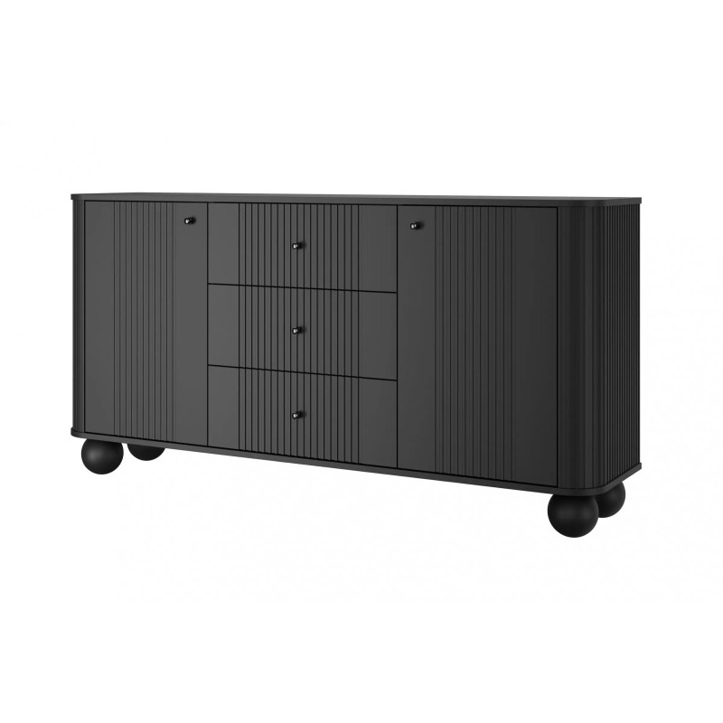Komoda Vesper w kolorze czarnym z kulistymi nogami to elegancki i funkcjonalny mebel, który doskonale wpasuje się w nowoczesne wnętrza. Jej minimalistyczny design, podkreślony ryflowanymi frontami i stylowymi uchwytami, nadaje pomieszczeniu wyrafinowanego charakteru. Kuliste nogi dodają lekkości konstrukcji, tworząc harmonijną całość.