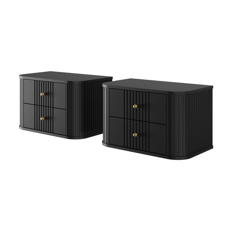 Zestaw wiszących szafek nocnych z kolekcji Vesper od Meble Bogart to eleganckie i funkcjonalne rozwiązanie dla nowoczesnych sypialni. Ich minimalistyczny design w głębokiej czerni, podkreślony ryflowanymi frontami i stylowymi uchwytami, wprowadza do wnętrza wyrafinowany charakter. Wisząca konstrukcja szafek nie tylko oszczędza miejsce, ale także nadaje lekkości aranżacji, ułatwiając utrzymanie porządku.