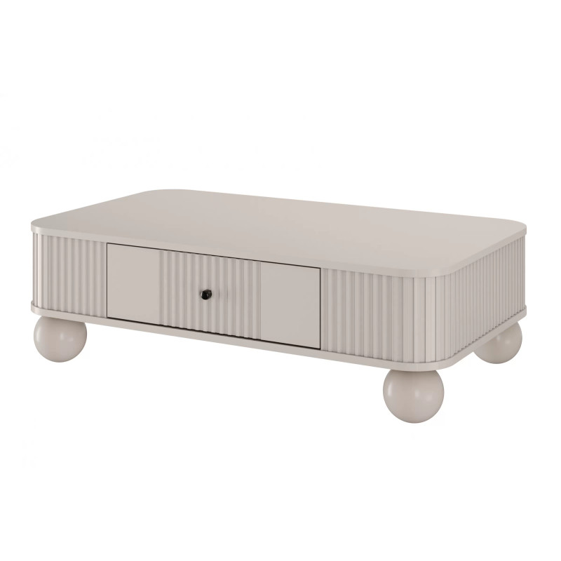 Stolik kawowy Vesper w kolorystyce kaszmiru to elegancki mebel, który doskonale wpisuje się w nowoczesne wnętrza. Jego zaokrąglone kształty i ryflowane fronty nadają mu unikalnego charakteru, a kuliste nogi w kolorze kaszmiru dodają lekkości i stylu.