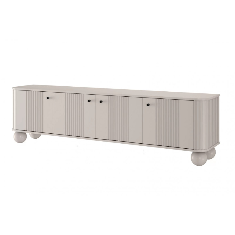 Szafka RTV Vesper 4D w kolorze kaszmir to elegancki i funkcjonalny mebel, idealny do nowoczesnych wnętrz. Jej minimalistyczny design, podkreślony ryflowanymi frontami i stylowymi uchwytami, nadaje pomieszczeniu wyrafinowanego charakteru. Konstrukcja o szerokości 187 cm i głębokości 38 cm sprawia, że szafka nie tylko oszczędza miejsce, ale także dodaje lekkości aranżacji.