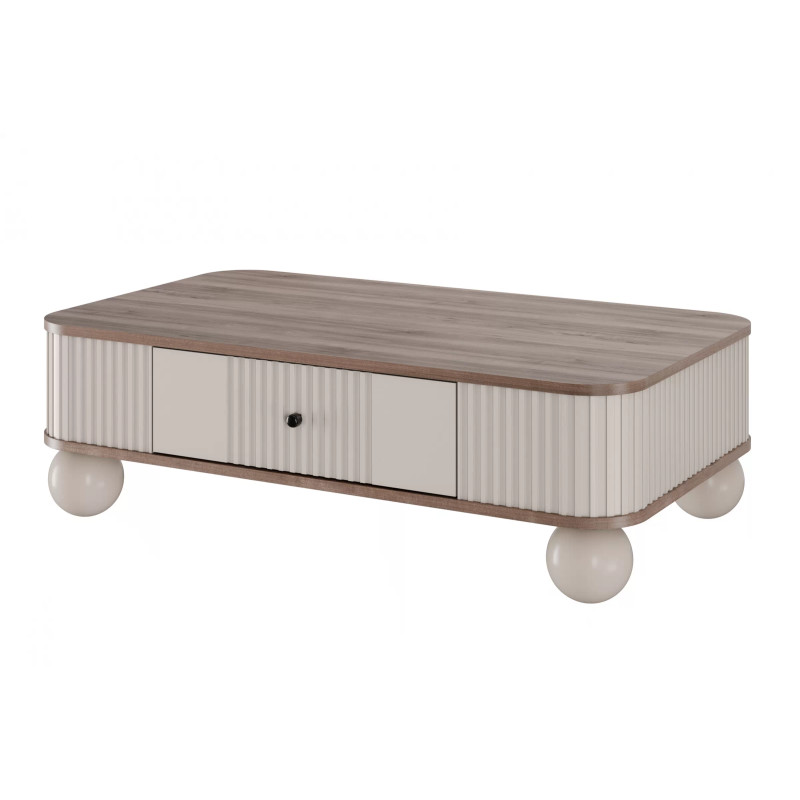 Stolik kawowy Vesper w kolorystyce kaszmiru i orzecha to elegancki mebel, który doskonale wpisuje się w nowoczesne wnętrza. Jego zaokrąglone kształty i ryflowane fronty nadają mu unikalnego charakteru, a kuliste nogi w kolorze kaszmiru dodają lekkości i stylu.