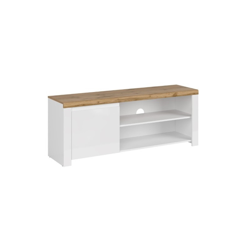 Szafka RTV VIGO 160 biały połysk / dąb wotan to praktyczny mebel do salonu, zaprojektowany z myślą o wygodnym ustawieniu telewizora oraz przechowywaniu sprzętu i akcesoriów multimedialnych. Duży i wytrzymały blat zapewnia miejsce pod telewizor, a połączenie półek otwartych i zamkniętych pomaga utrzymać porządek w strefie wypoczynkowej. To trafny wybór dla osób, które szukają nowoczesnej szafki RTV 160 cm do salonu.