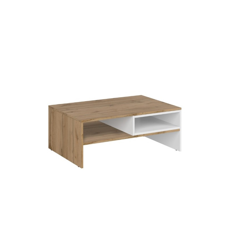 Połączenie bieli z ciepłym dekorem dąb wotan nadaje bryle lekkości i elegancji, dzięki czemu ława dobrze wpisuje się w nowoczesne aranżacje pokoju dziennego. Mebel może być ustawiony wraz z innymi bryłami z kolekcji VIGO, ale równie dobrze sprawdzi się jako niezależny dodatek. Nowoczesna ława kawowa biały połysk z półką to funkcjonalne rozwiązanie do wnętrz, w których liczy się prostota i porządek.