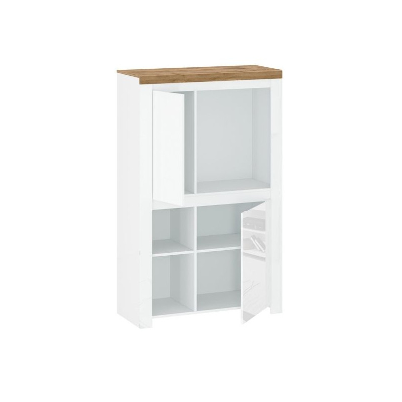 Regał niski dwudrzwiowy VIGO biały połysk / dąb wotan to funkcjonalny mebel do przechowywania, który dobrze odnajduje się w salonie, pokoju młodzieżowym, pokoju dziecięcym, jadalni, przedpokoju oraz domowym biurze. Zestawienie otwartych półek i przestrzeni schowanej za frontami pozwala wygodnie uporządkować książki, dokumenty, dekoracje i codzienne akcesoria. To świetna propozycja dla osób, które szukają nowoczesnego regału z zamkniętym i otwartym przechowywaniem.