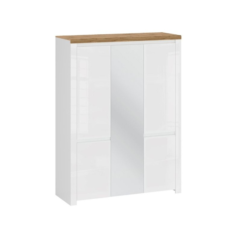 Szafa z lustrem pięciodrzwiowa VIGO biały połysk / dąb wotan to pojemny mebel do przechowywania, który sprawdzi się w sypialni, garderobie, pokoju dziecięcym, pokoju młodzieżowym oraz przedpokoju. Duża przestrzeń na ubrania wiszące oraz dodatkowe półki za zamkniętymi drzwiami pomagają wygodnie uporządkować odzież, tekstylia i akcesoria. To doskonała propozycja dla osób, które szukają dużej szafy z lustrem do nowoczesnej sypialni.