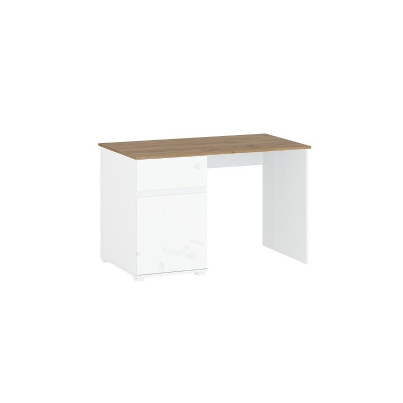 Model posiada wbudowaną szufladę oraz półki schowane za drzwiczkami, dzięki czemu łatwiej utrzymać porządek na stanowisku pracy. Wszystkie potrzebne przedmioty można mieć w zasięgu ręki, bez nadmiernego zajmowania blatu. Zestawienie białego połysku z dekorem dąb wotan podkreśla nowoczesny charakter mebla i sprawia, że biurko dobrze komponuje się z wieloma aranżacjami wnętrz.