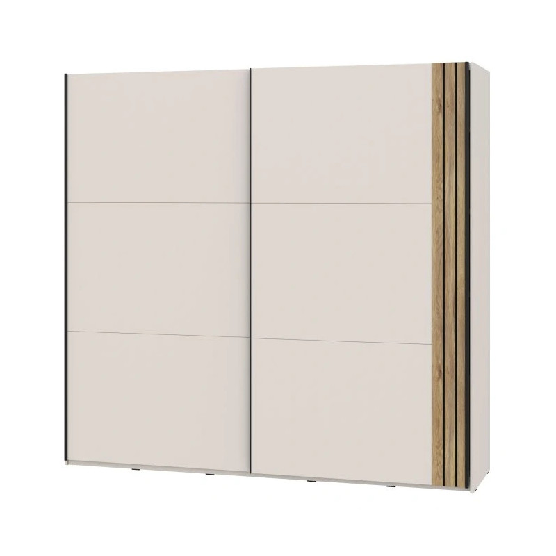 Szafa przesuwna WAIKATO 220 cm to połączenie skandynawskiej estetyki i funkcjonalności, które sprawdzi się idealnie w nowoczesnej sypialni. Jej jasny dekor piaskowy w zestawieniu z kontrastującymi detalami w kolorze black tworzy stylowy, a zarazem przytulny klimat. Drzwi przesuwne ułatwiają dostęp do wnętrza nawet w mniejszych pomieszczeniach, a ich fronty ozdobione dekoracyjnymi lamelami podkreślają elegancję i naturalny charakter mebla.
