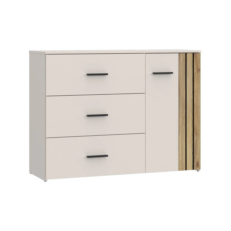 Komoda WAIKATO to stylowy i funkcjonalny mebel, który doskonale wpisuje się w aranżacje inspirowane stylem skandynawskim. Dzięki kompaktowym wymiarom i praktycznemu układowi wnętrza stanowi świetny wybór do sypialni, przedpokoju lub pokoju dziennego. Jej dekor Piaskowy z elementami Dąb Riviera wnosi do wnętrza naturalne ciepło i subtelną elegancję.