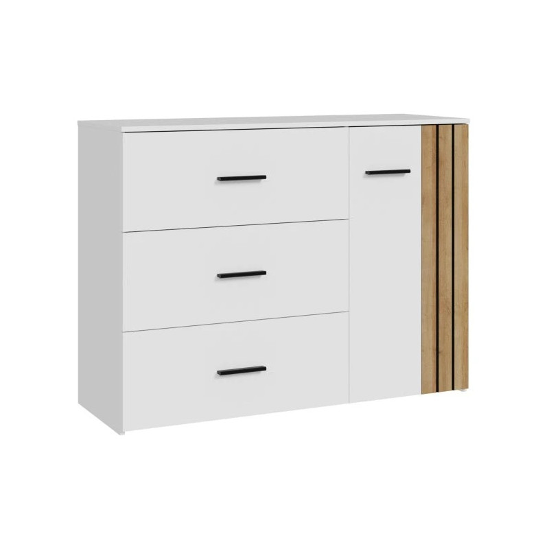 Wnętrze komody zostało zaprojektowane z myślą o praktyczności – 3 szuflady i 1 szafka z półką umożliwiają przechowywanie dokumentów, odzieży, drobnych akcesoriów i wszystkiego, co chcesz mieć pod ręką. Blat komody stanowi doskonałe miejsce na ekspozycję zdjęć, dekoracji i pamiątek rodzinnych. To uniwersalny mebel, który sprawdzi się w wielu wnętrzach.