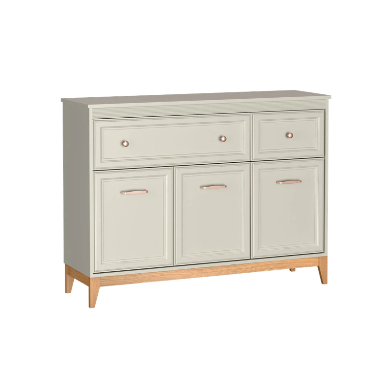 Wysoka na 100 cm, oferuje trzy zamykane drzwi i dwie szuflady, co zapewnia mnóstwo miejsca na przechowywanie, jednocześnie dbając o harmonię i porządek w przestrzeni. Lite dębowe nogi gwarantują stabilność i nadają meblowi naturalnego uroku, a miedziane, metalowe uchwyty stanowią delikatny akcent dekoracyjny.