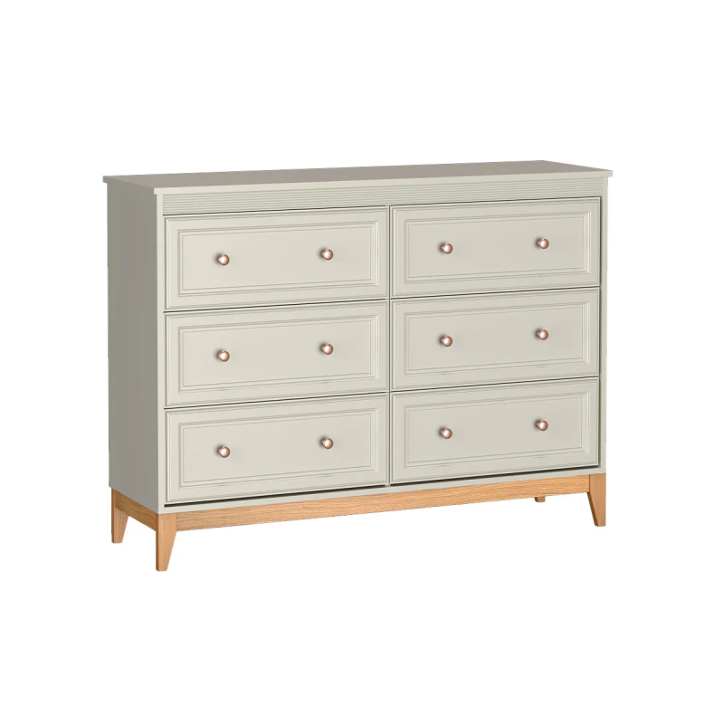 Komoda WINDSOR kaszmir z 6 szufladami to harmonijne połączenie ponadczasowego stylu z funkcjonalnością codziennego użytku. Subtelny odcień kaszmiru i naturalne drewno dębowe w detalach tworzą ciepłą, elegancką kompozycję, która z łatwością dopasuje się do klasycznych, skandynawskich i nowoczesnych aranżacji.