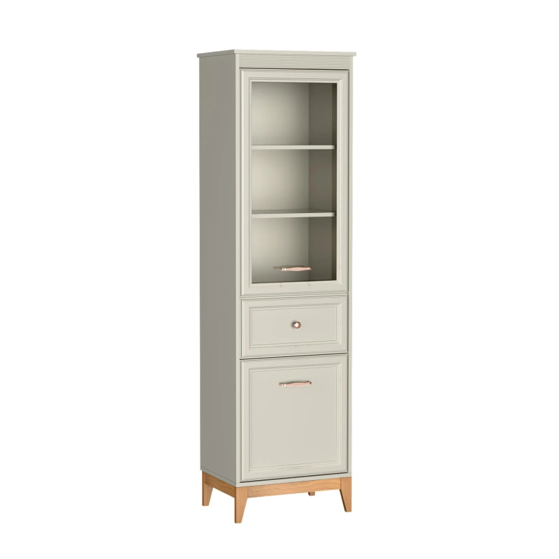 Witryna WINDSOR W-6 to wysoka i smukła propozycja dla osób, które szukają stylowego mebla do ekspozycji i przechowywania. Dzięki przeszklonej górnej części z delikatnym frezowaniem mebel nabiera lekkości i elegancji, idealnie eksponując porcelanę, szkło lub książki. Kaszmirowy kolor frontów oraz detale w postaci metalowych uchwytów tworzą harmonijną całość, łącząc klasykę z nowoczesnym minimalizmem.