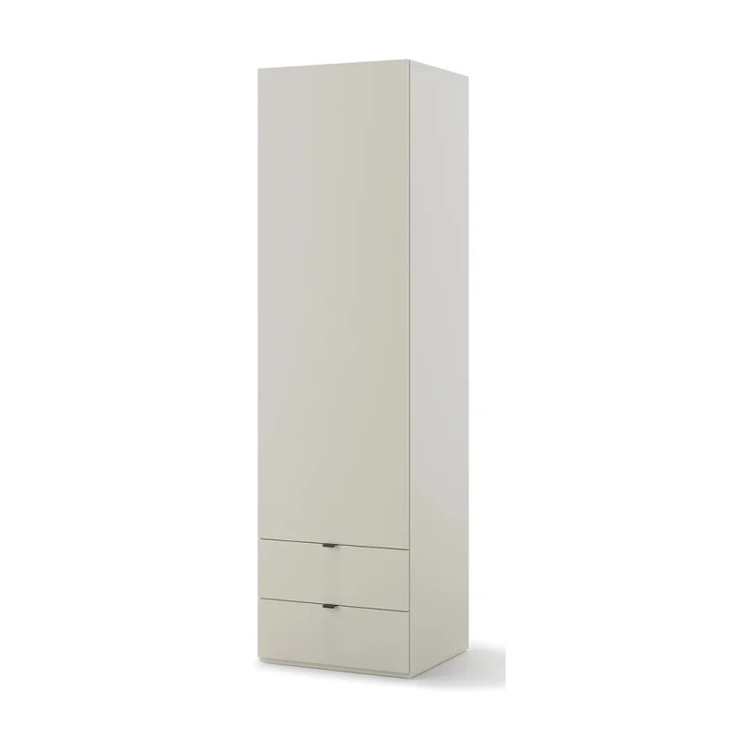 Wnętrze szafy oferuje cztery praktyczne półki idealne na odzież, książki lub inne akcesoria codziennego użytku. Dwie głębokie szuflady w dolnej części to wygodne rozwiązanie do przechowywania bielizny, drobnej elektroniki lub dodatków. Drzwi uchylne osłaniają całość, zachowując estetykę pomieszczenia, a gładka powierzchnia frontu umożliwia personalizację zgodną z upodobaniami użytkownika.