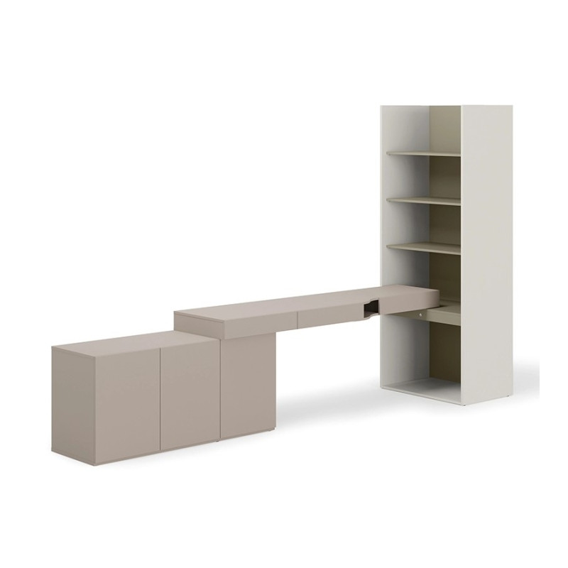 Połączenie trzech odcieni – clay grey, eukaliptus i szampański – nadaje zestawowi wyjątkowy, młodzieżowy charakter. Przemyślany układ zawiera 9 półek, 3 pojemne szuflady i 3 drzwi, otwierane za pomocą estetycznych podchwytów. Całość została zaprojektowana tak, by odpowiadać zarówno na codzienne potrzeby, jak i wspierać rozwój samodzielności i organizacji młodych ludzi.