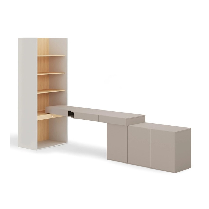 Połączenie trzech odcieni – clay grey, eukaliptus i szampański – nadaje zestawowi wyjątkowy, młodzieżowy charakter. Przemyślany układ zawiera 9 półek, 3 pojemne szuflady i 3 drzwi, otwierane za pomocą estetycznych podchwytów. Całość została zaprojektowana tak, by odpowiadać zarówno na codzienne potrzeby, jak i wspierać rozwój samodzielności i organizacji młodych ludzi.