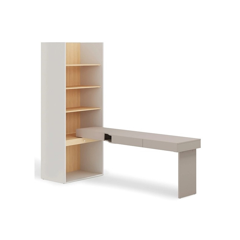 Kolorystyka łącząca clay grey, dąb vicenza bielona i szampański nadaje całości nowoczesnego i eleganckiego charakteru. Szeroki blat doskonale sprawdzi się jako miejsce do nauki lub pracy z komputerem, natomiast zintegrowany regał z 5 otwartymi półkami umożliwia uporządkowane przechowywanie książek, dokumentów i dekoracji.