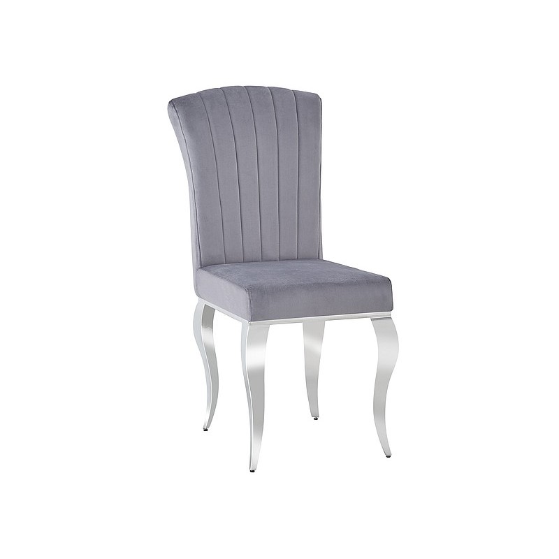 Design krzesła wyróżnia się wysokim oparciem z lekko wygiętym szczytem, ozdobnymi przeszyciami oraz błyszczącymi nogami chromowanymi. Szara tkanina aksamitna nadaje mu delikatnego blasku, a jednocześnie jest miękka i przyjemna w dotyku, zapewniając komfort podczas siedzenia.