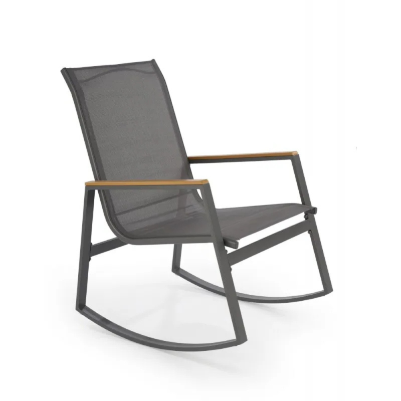 Krzesło ogrodowe bujane, łączące w sobie klasyczny i nowoczesny styl, idealny do relaksu na świeżym powietrzu. Tapicerka z trwałej siatki zapewnia przewiewność, a stelaż w popielatym kolorze harmonizuje z całością.