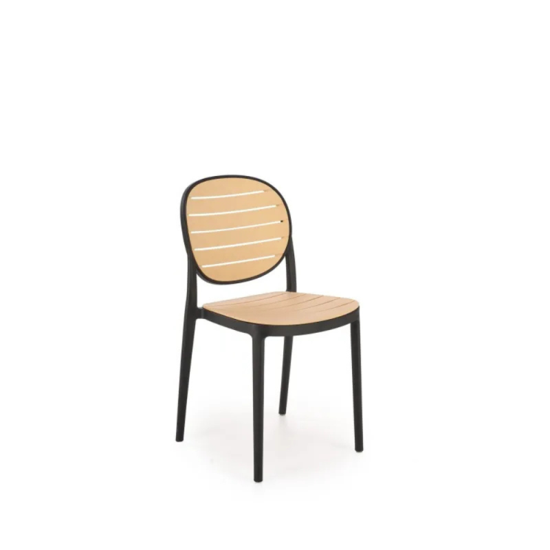 Jego siedzisko i oparcie, stworzone z wytrzymałego tworzywa w kolorze czarnym z elementami w kolorze naturalnym, nadaje krzesłu elegancki wygląd. Solidna podstawa z czterech nóg zapewnia stabilność i trwałość.