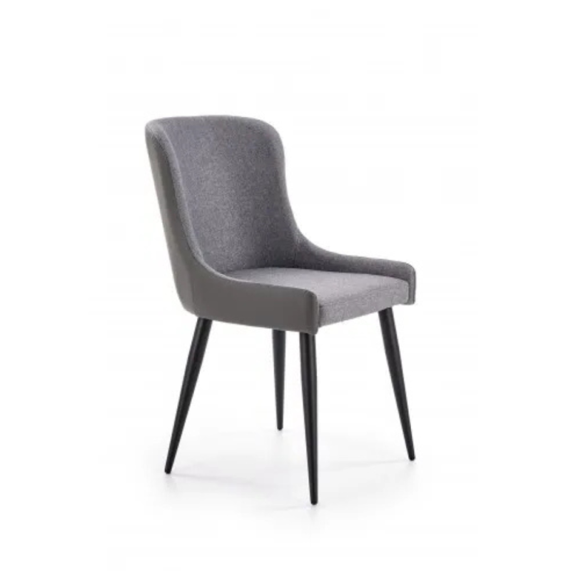 Krzesło jest tapicerowane dwoma różnymi materiałami, co nadaje mu oryginalny wygląd. Ciemno popielata ekoskóra została zastosowana na tyle oparcia i siedziska, dodając elegancji i łatwości w utrzymaniu czystości. Natomiast jasno popielata tkanina materiałowa z przodu nadaje krzesłu ciepłego wyglądu. Okrągłe nogi wykonane ze stali, malowane proszkowo na czarny kolor, doskonale harmonizują z szarością obu materiałów.
