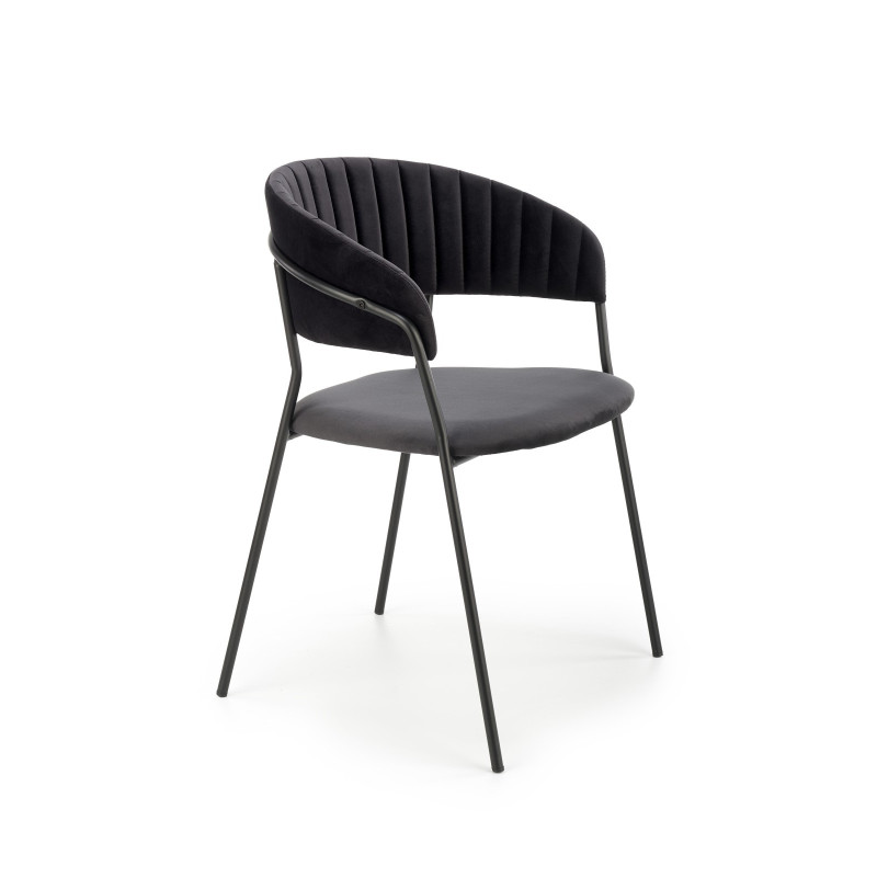 Tkanina obiciowa typu velvet o subtelnej fakturze nadaje krzesłom elegancki wygląd, który doskonale harmonizuje zarówno z nowoczesnymi, jak i glamourowymi wystrojami pomieszczeń. Oparcie ozdobione jest pionowymi przeszywami na całej szerokości, dodając mu niepowtarzalnego charakteru.