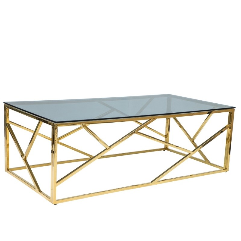 Ława ESCADA A wyróżnia się niezwykle charakterystycznym i dekoracyjnym wyglądem, dzięki intensywnemu, złotemu kolorowi stelaża wykonanego z metalu. Stanowi ona wyrazisty element, który z pewnością przyciąga uwagę w każdym wnętrzu. Jej interesująca i niekonwencjonalna konstrukcja, połączona z artystycznym podejściem, doskonale współgra zarówno z ekskluzywnymi meblami skórzanymi, podkreślając luksusowy standard pomieszczenia, jak i z prostszym wyposażeniem, tworząc zaskakujący kontrast kolorystyczny. Stelaż stolika kawowego wyróżnia się ciekawym wzorem, doskonale harmonizującym z wykonanym z hartowanego szkła dymionego blatem mebla.