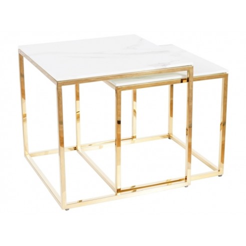 Zestaw dwóch ław Gloria stanowi niezwykle praktyczny meblowy duet, stworzony przez renomowanych projektantów firmy Signal. Te meble zostały wykreowane zgodnie z najnowszymi trendami w stylach nowoczesnym i glamour, co sprawia, że od razu przyciągają uwagę swoją estetyką. Charakter tego zestawu umożliwia ich doskonałe dopasowanie do różnych wnętrz domowych. Są one szczególnie popularne w aranżacjach glamour oraz w innych bogato zdobionych przestrzeniach. Ławy charakteryzują się kwadratowymi blatami wykonanymi ze szkła hartowanego, które imitują efekt białego marmuru. Stal nierdzewna, pomalowana na złoty kolor, została użyta do stworzenia solidnych podstaw mebli. Cztery proste nogi wychodzące od blatu łączą się na dole w formie kwadratowej podstawy, nadając całości niezwykle estetyczny wygląd.